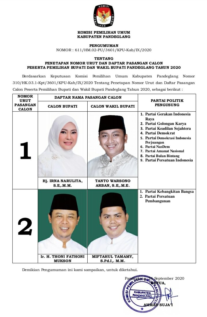 Hal itu ditetapkan KPU Kabupaten Pandeglang melalui surat keputusan KPU Nomor 310/HK.03.1-Kpt/3601/KPU-Kab/IX/2020 Tentang Penetapan Nomor Urut dan Daftar Pasangan Calon Peserta Pemilihan Bupati dan Wakil Bupati Pandeglang 2020.