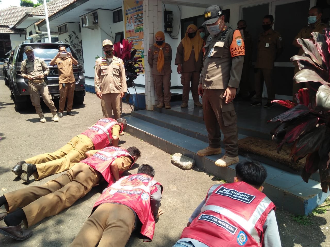 Akibat perilaku mereka itu, para ASN diberi sanksi sosial dan fisik. Dengan mengenakan jaket bertulisan “Pelanggar protokol kesehatan”, mereka dihukum membersihkan lingkungan sekitar dan sanksi fisik berupa push-up.
