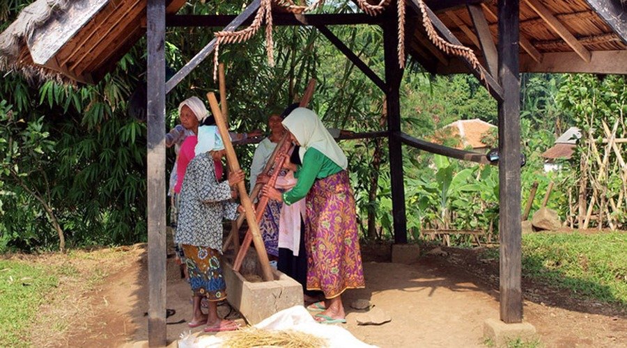 Gedeg-gedeg padi tersuun dalan lumbung panjang, setelah menjadi butiran gabah masuk ke lumbapng, tangan-tangan perempuan terus menumbuk hingga gabah menjadi beras.