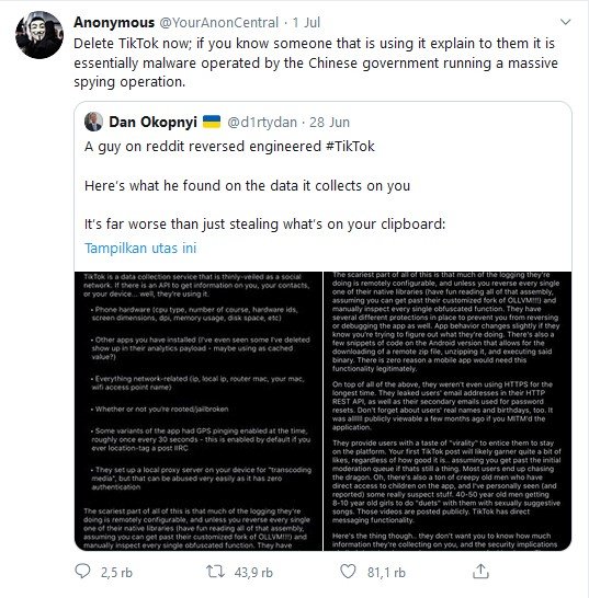 “Hapus TikTok sekarang. Kalau kalian tahu ada orang yang memakai aplikasi ini, jelaskan ke mereka kalau itu (TikTok) pada dasarnya merupakan malware yang dioperasikan oleh Pemerintah Cina untuk menjalankan operasi mata-mata,” tulis Anonymous.