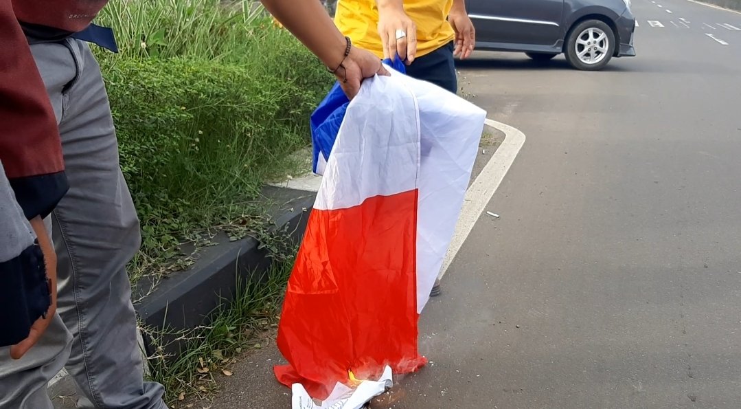 Pembakaran bendera merah, putih, biru yang menjadi kebanggan Prancis itu, dilakukan di depan pancaniti Alun-alun Pandeglang, Selasa (3/11/2020).
